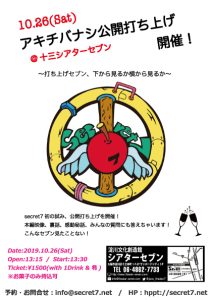 2019年10月26日10/26(土)打ち上げセブン、下からみるか横からみるか@十三シアターセブン 大盛況で終了いたしました! 御来場いただいたみなさま、ご出演して下さいました皆様、シアターセブン様 ありがとうございました! 初の試み、公開う… 続きを読む